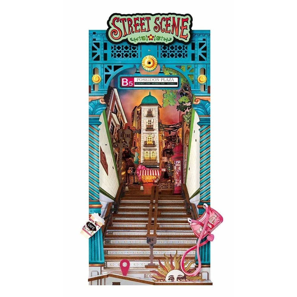 Transform your shelf into an urban transit hub with the Street Scene book nook. It exudes the energy of a bustling city, with its narrow stairs that draw your eye in. There's a street-level perspective on the upper half, complete with street lamps, signage, pavement textures, and lit buildings. Familiar items flank the bottom of the stairs, including a paper coffee cup and a pink crossbody bag that hints at a commuter's daily routine. For tourists, there's a stylized sun face and a map pin icon that implies location-based adventures.?A witty feature is the train station, hidden underneath the stairs and found on the book nook's side, a pleasant surprise when you pull out this insert. The finishing touch is the LED lighting options that create dazzling sunset or night city views.