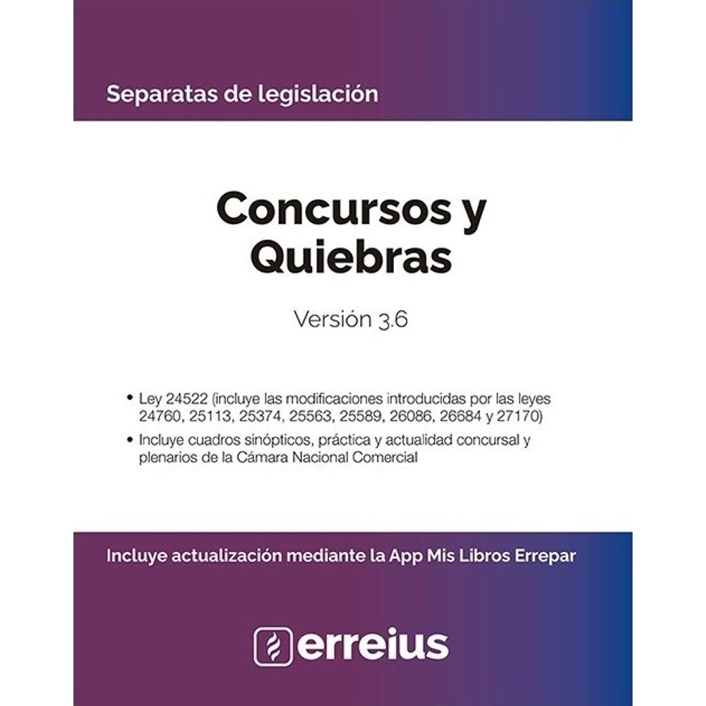 | Sinopsis | CONCURSOS Y QUIEBRAS VERSIÓN 3.6 - SEPARATAS DE LEGISLACIÓN Edad recomendada: Adultos. |