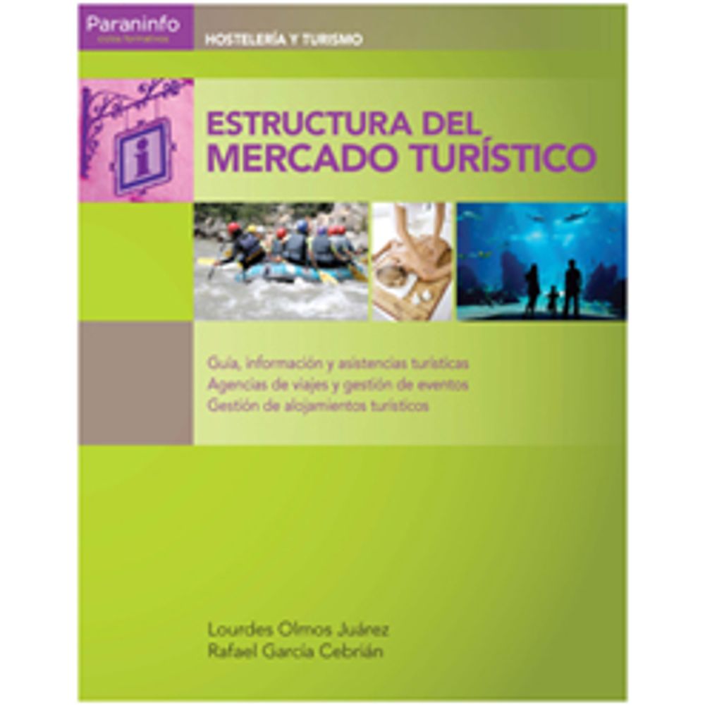 | Sinopsis | Este libro ha sido concebido como libro de texto para el módulo profesional de Estructura del Mercado Turístico, de los Ciclos Formativos de grado superior de Agencias de Viajes y Gestión de Eventos, Gestión de Alojamientos Turísticos, y Guía, Información y Asistencias Turísticas, de la familia profesional de Hostelería y Turismo. |