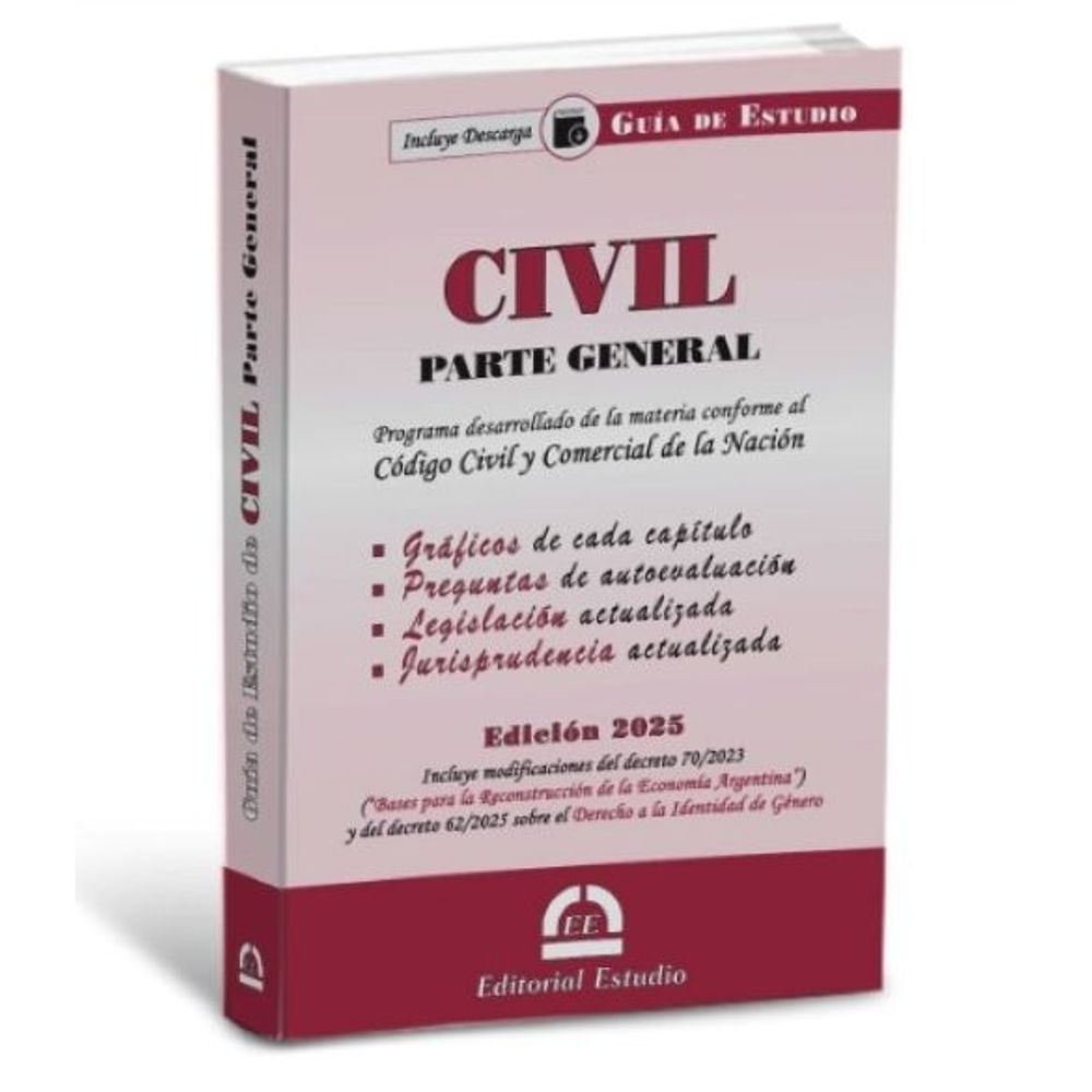 Esta Guía de Estudio de Derecho Civil, desarrollada de acuerdo al Código Civil y Comercial, explica en forma clara, didáctica y con numerosos ejemplos todos los temas de la Parte General del Derecho Civil fuentes, la ley, derechos y bienes, persona humana, fin de su existencia, capacidad, derechos subjetivos, derechos y actos personalísimos, nombre, domicilio, representación, tutela y curatela, personas jurídicas, bienes, hechos y actos jurídicos, etc. .