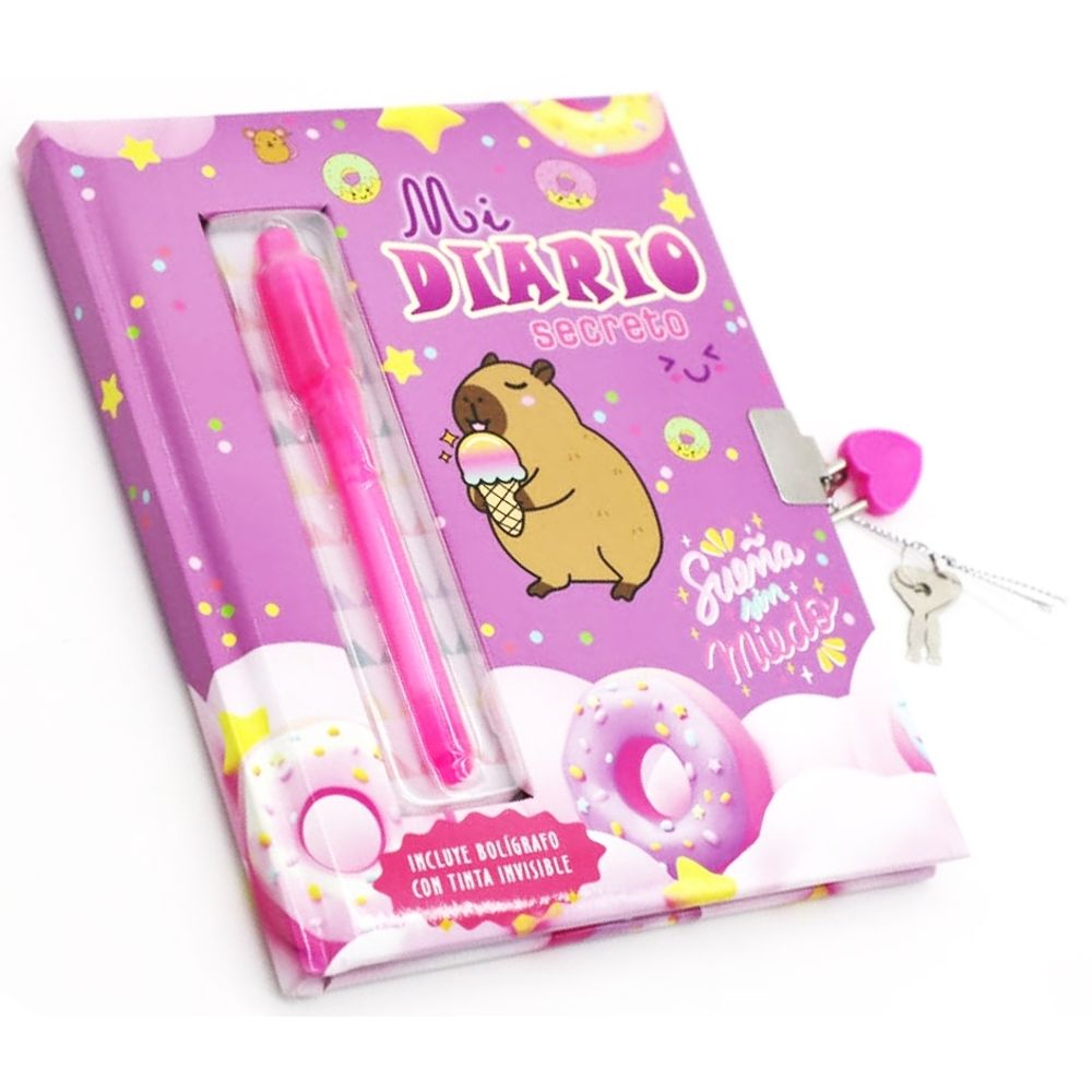 | Sinopsis | MI DIARIO SECRETO - LILA - CARPINCHO Diario secreto a todo color, con tapa dura de cartón con estampado metálico sobre esponja de 3mm troquelado BOLÍGRAFO MÁGICO TINTA INVISIBLE que se ve con luz azul CANDADO Edad recomendada: A partir de 6 años. |
