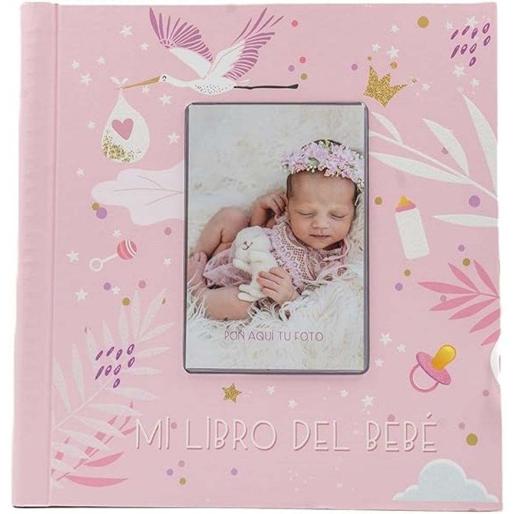 3. Portada de tapa dura con glitter y marco personalizable para la foto del niño. Encuadernación de anillas y cierre con lazo blanco. Es muy fácil personalizar la portada y hacer del libro álbum algo único