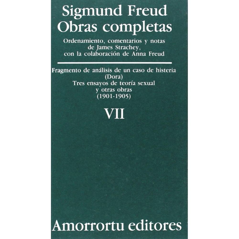 Indice general abreviado:Advertencia sobre la edición en castellano. Lista de abreviaturas. Fragmento de análisis de un caso de histeria 1905 1901 . Tres ensayos sobre teoría sexual 1905 . I. Las aberraciones sexuales. II. La sexualidad infantil. III. Las metamorfosis de la pubertad. Resumen. Apéndice. Escritos de Freud que versan predominantemente o en gran parte sobre la sexualidad. Colaboraciones para Neue Freie Presse 1903-04 . El método psicoanalítico de Freud 1904 1903 . Sobre psicoterapia 1905 1904 . Mis tesis sobre el papel de la sexualidad en la etiología de las neurosis 1906 1905 . Personajes psicopáticos en el escenario 1942 1905 o 1906 . Bibliografía e índice de autores. Indice alfabético.