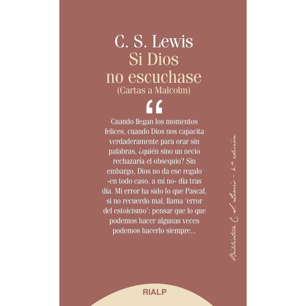 La oración es un puro don, un gran regalo de Dios. Así la entiende también Lewis. Con su habitual brillantez, se sirve de la correspondencia que mantiene con otro intelectual, para aportar luz sobre cuestiones como: ¿qué valor tiene la oración?, ¿es un soliloquio que nadie escucha?, ¿tiene sentido rezar por los difuntos?, ¿por qué es importante la liturgia? En sus argumentos, Lewis muestra una vigorosa convicción y, a la vez, una gran sensibilidad y comprensión hacia las debilidades y miedos del hombre.