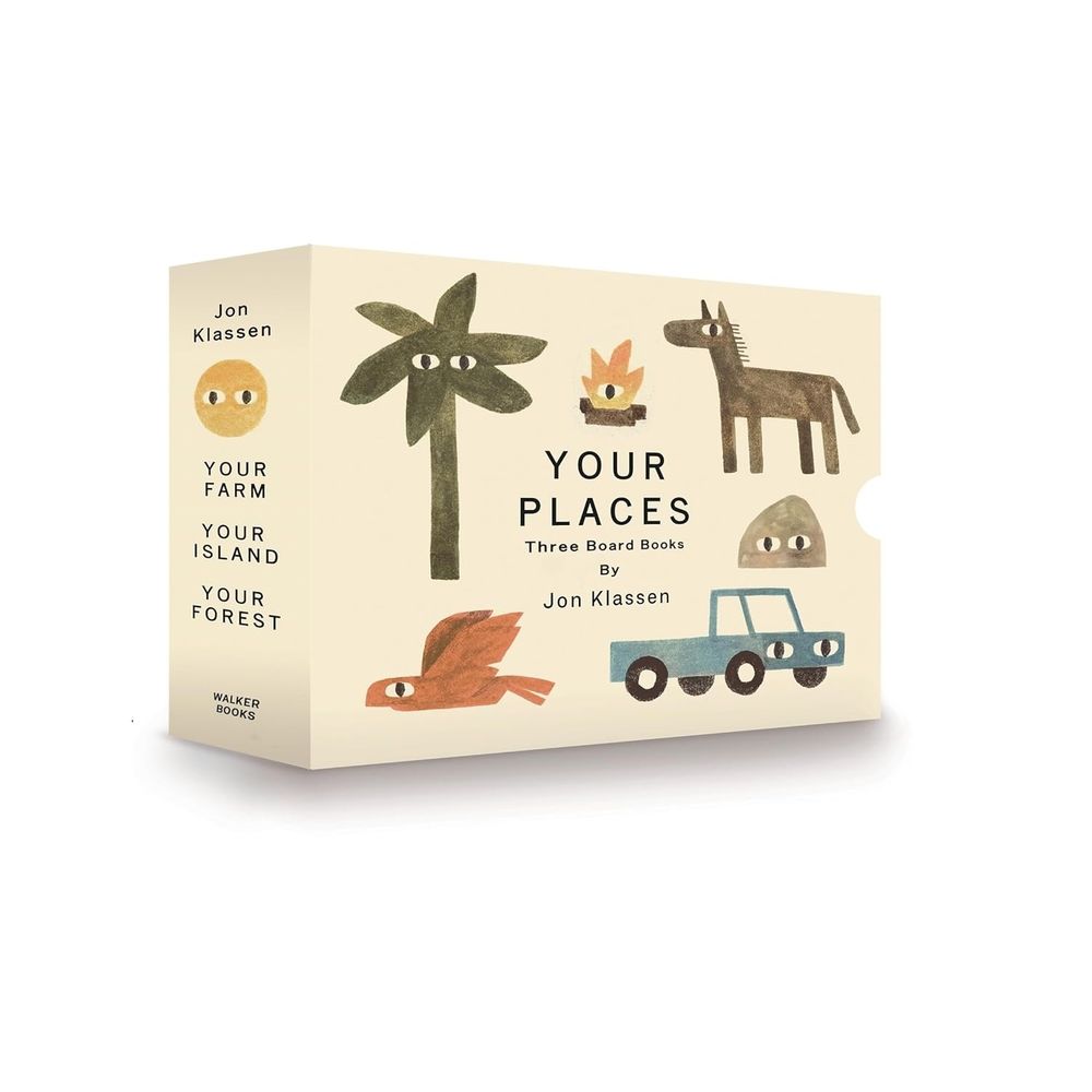 With a minimal tableau of familiar objects and a gentle rhythm suited for reading aloud, a farm, a forest and an island are assembled with all their items, ending with bedtime as the sun goes down. These are places for a young child to have whenever they want to go there. This trio of board books, focusing on safe spaces, comfort, and imagination, signals new ground for Jon Klassen, even as peculiar touches of whimsy stamp them as iconically his.